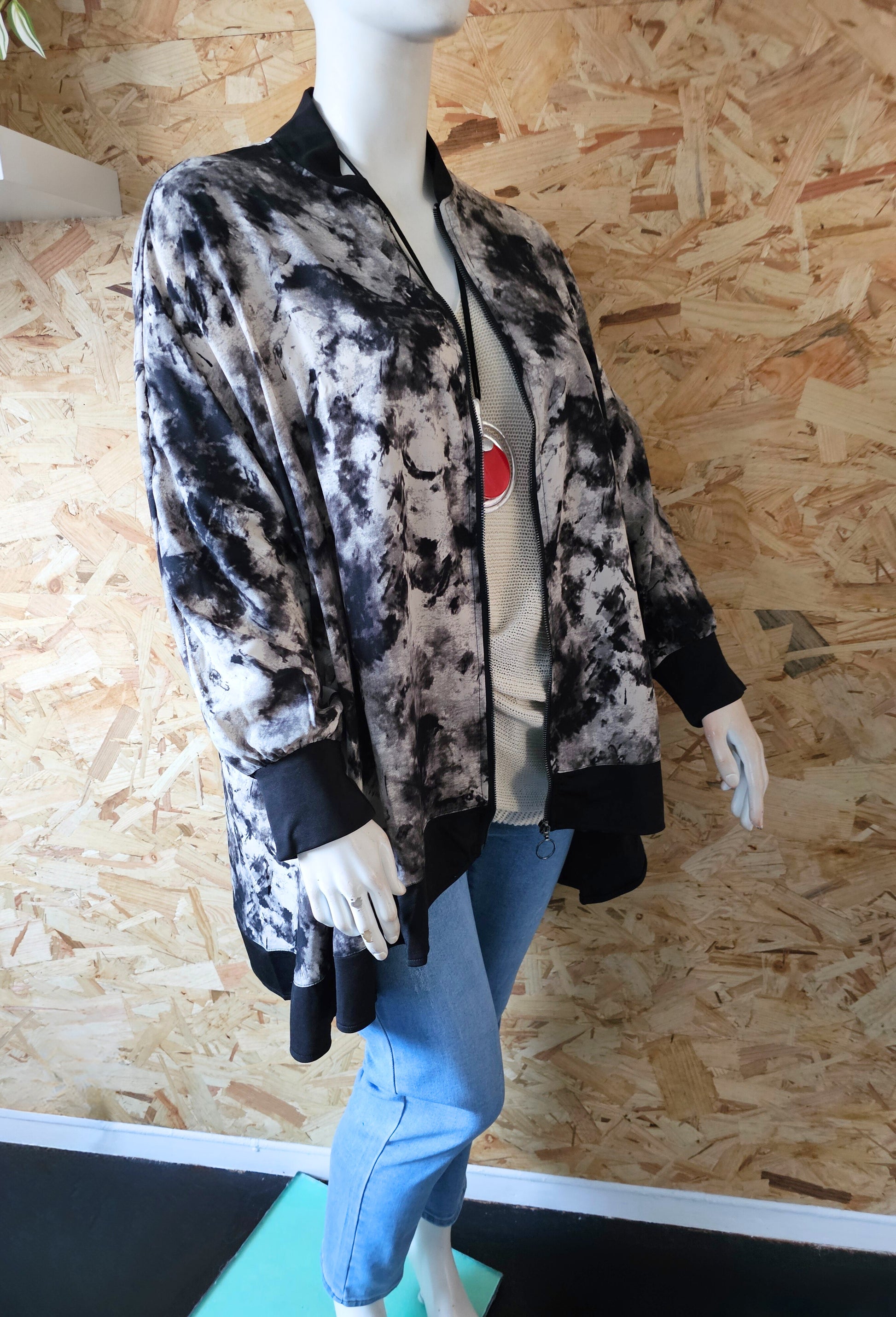 I s'agit d'une inspiration type Bombers avec tous les codes du bombers ( poignets resserrés en bord côte, col en bord côte et zip de fermeture ) Mais sa grande singularité , c'est sa finition en coupe évasée ! Une coupe trapèze très fluide, avec une magnifique ampleur de tissu.