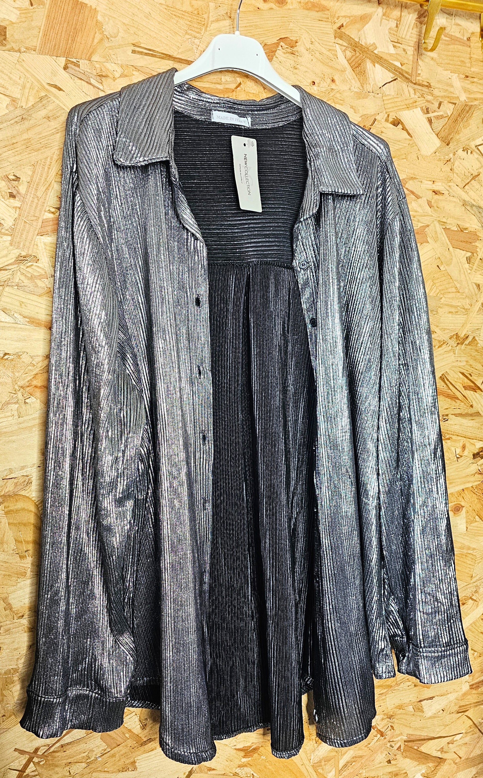 Chemise festive en tissu brillant argenté , aspect "gaufré en rayures", parfaite pour sublimer tous vos moments habillés, vos soirées. Coupe intemporelle avec boutonnage intégral devant et poignets boutonnés pour un ajustement précis. Le pli d'aisance au dos assure confort et liberté de mouvement. L'intérieur est noir brillant. À porter fermée pour une élégance classique ou en surchemise pour un style plus décontracté. Texture raffinée sans motifs, juste la brillance subtile du gaufrage qui capte la lumière.