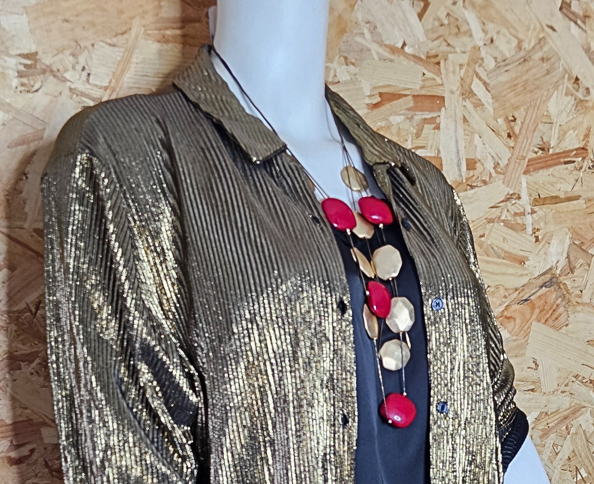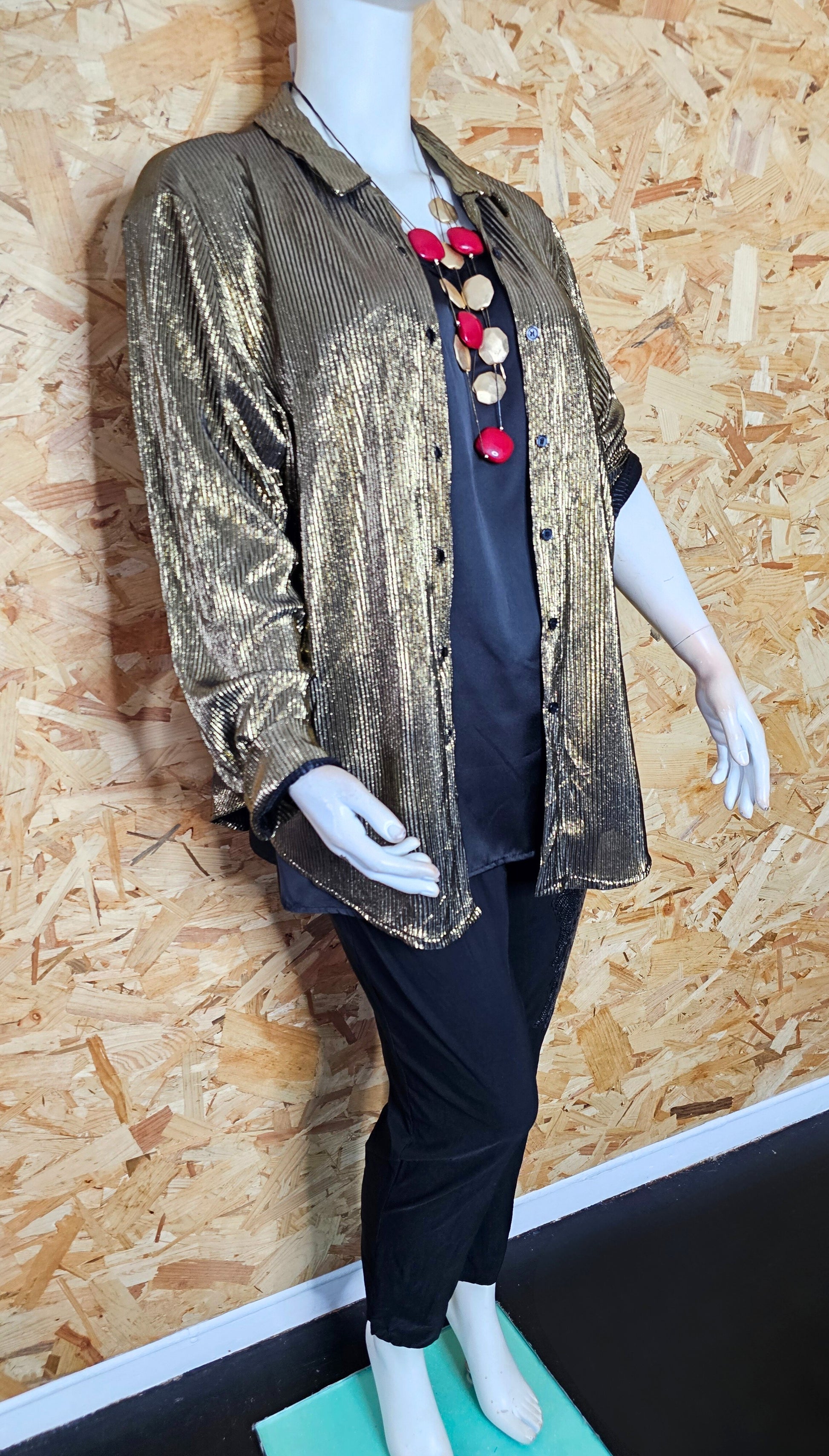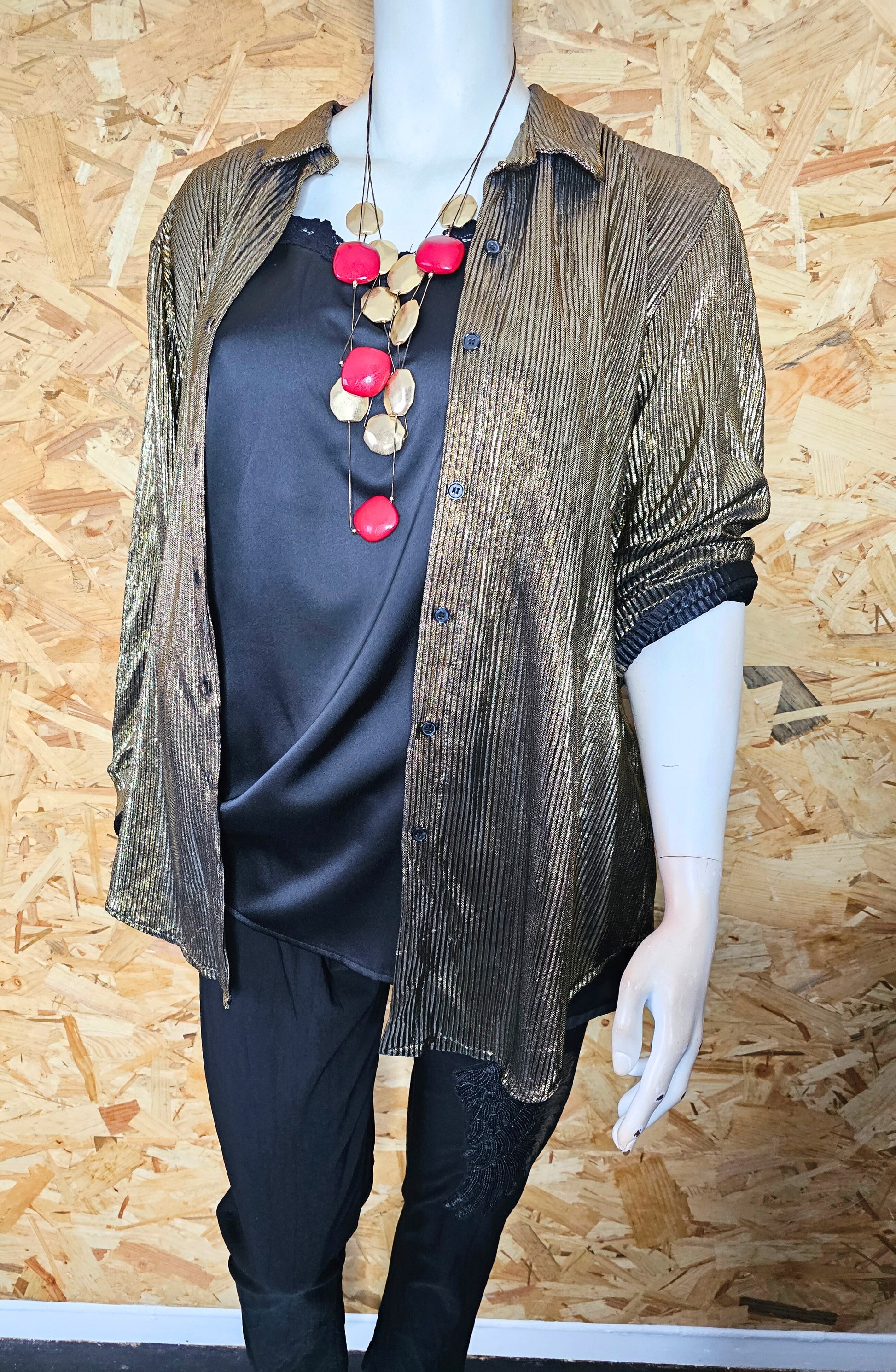Chemise festive en tissu brillant or , aspect "gaufré en rayures", parfaite pour sublimer tous vos moments habillés, vos soirées. Coupe intemporelle avec boutonnage intégral devant et poignets boutonnés pour un ajustement précis. Le pli d'aisance au dos assure confort et liberté de mouvement. L'intérieur est noir brillant. À porter fermée pour une élégance classique ou en surchemise pour un style plus décontracté. Texture raffinée sans motifs, juste la brillance subtile du gaufrage qui capte la lumière.