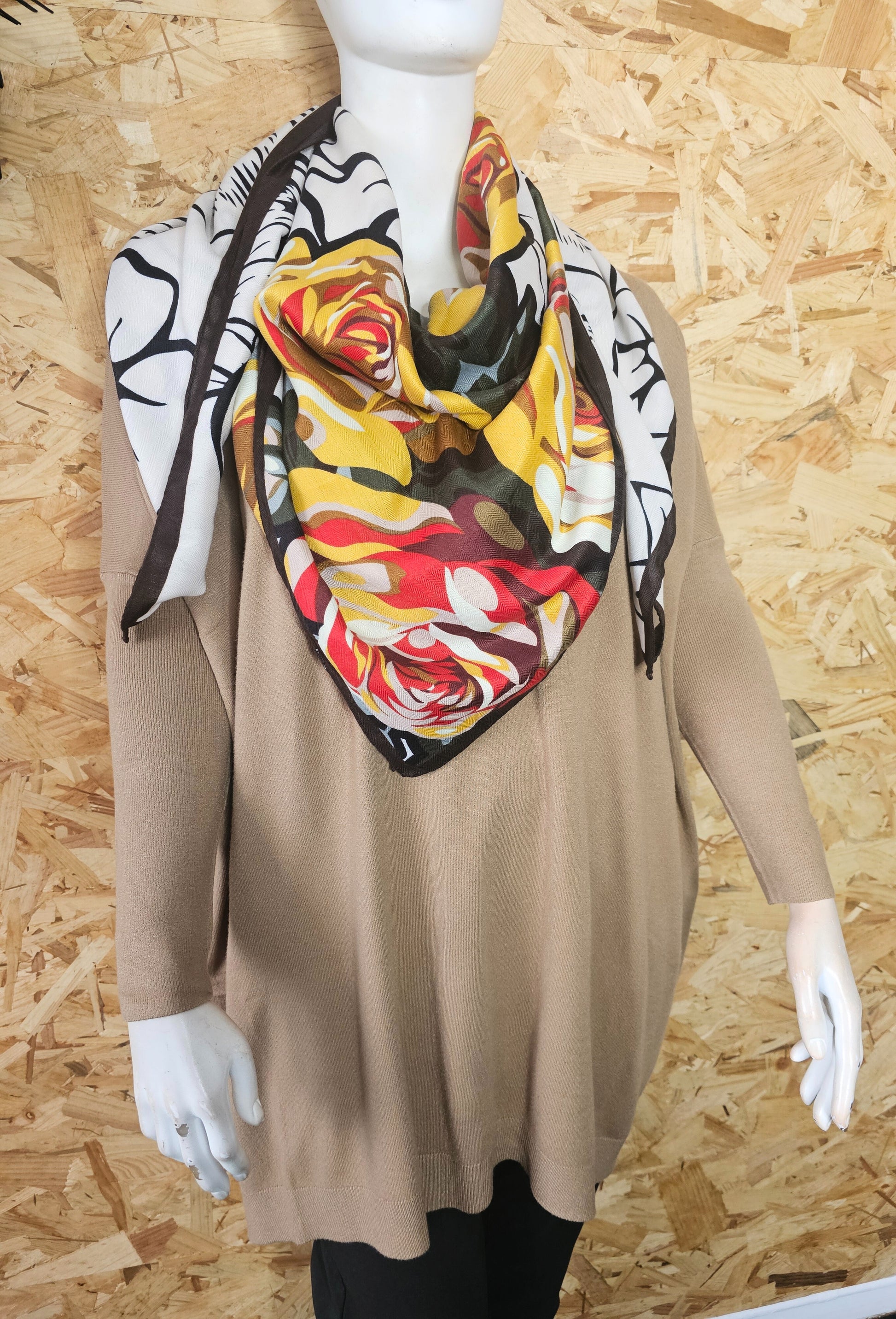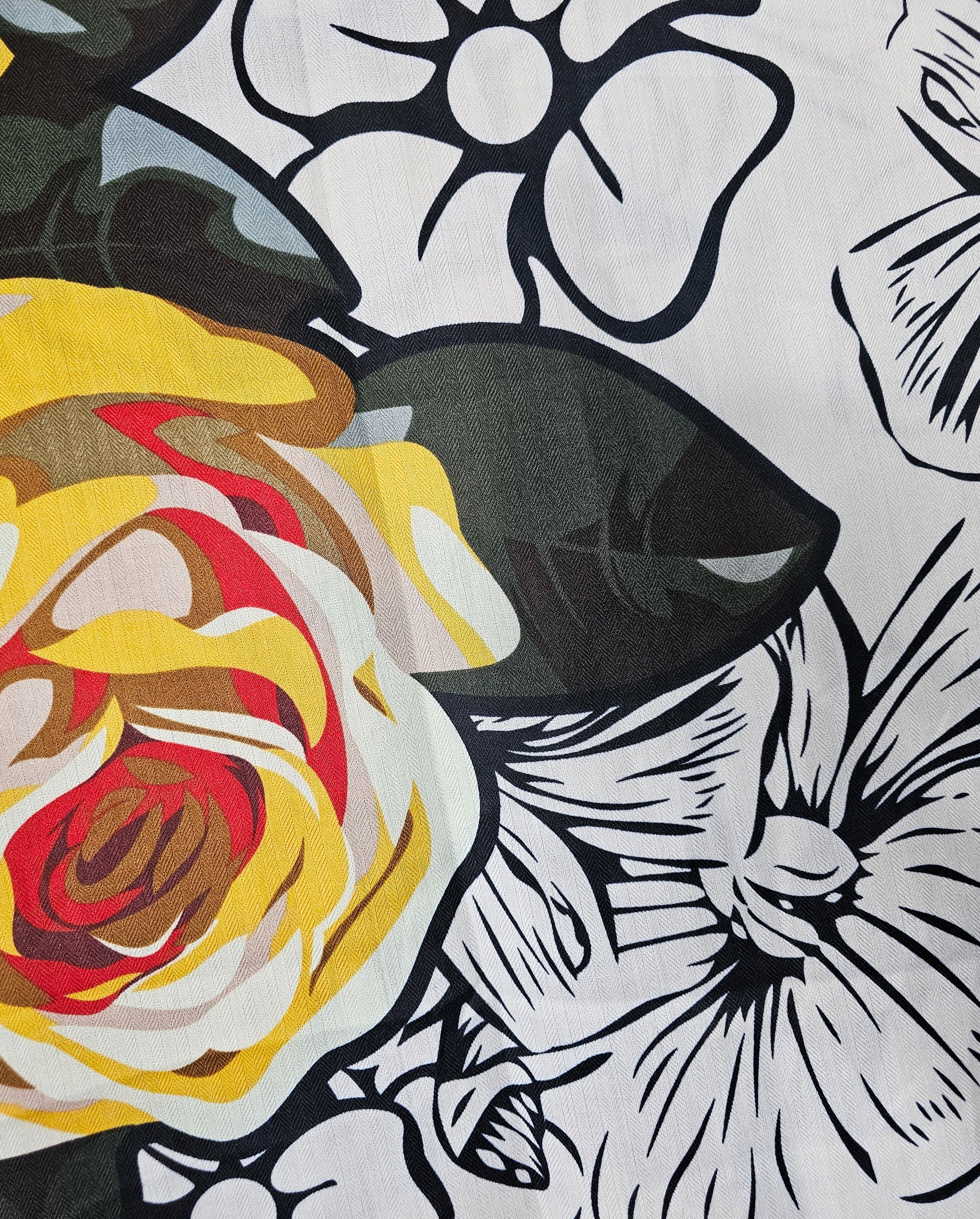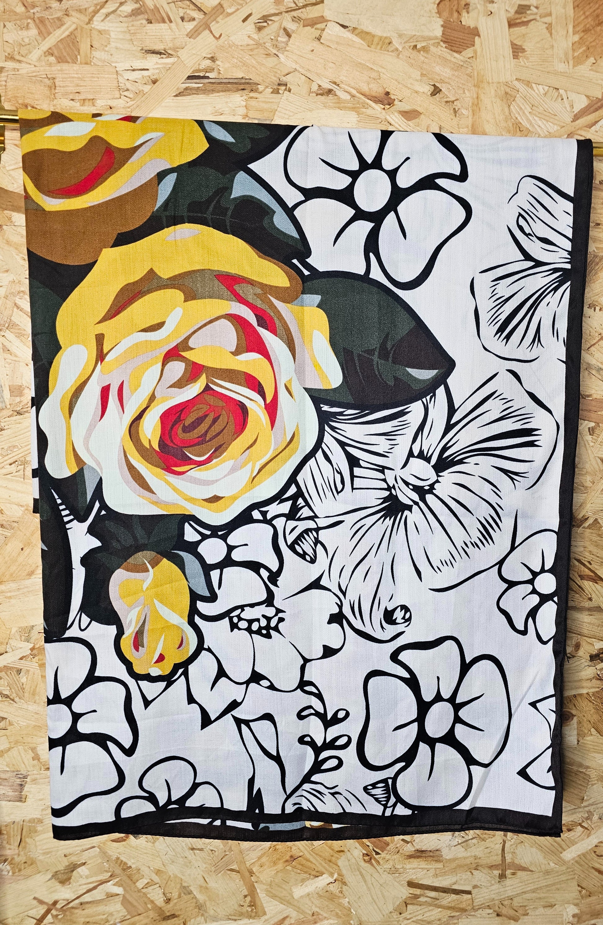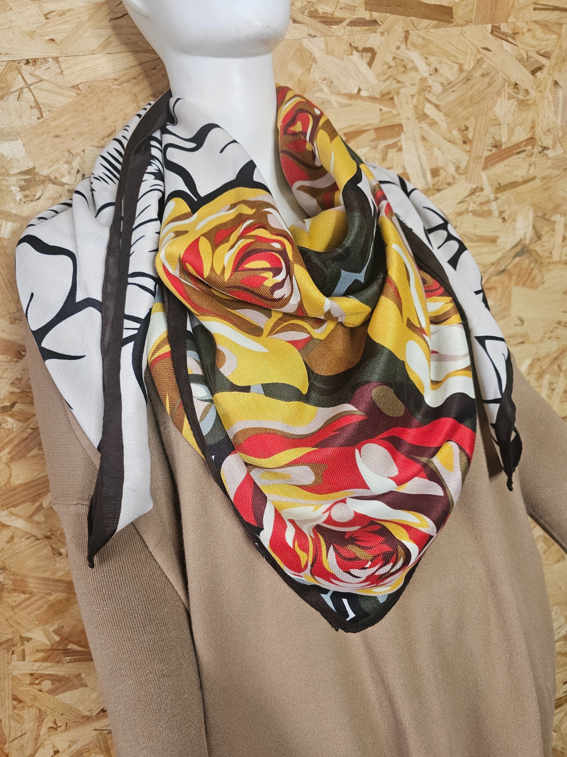 Étole aux motifs de fleurs stylisées, confectionnée en très grand carré . Portez-la en chèche pour un style affirmé, pliée en triangle avec la pointe sur l'avant pour belle allure . Cette pièce incontournable s'adapte à vos envies du jour, sublimant vos tenues avec élégance et sophistication.