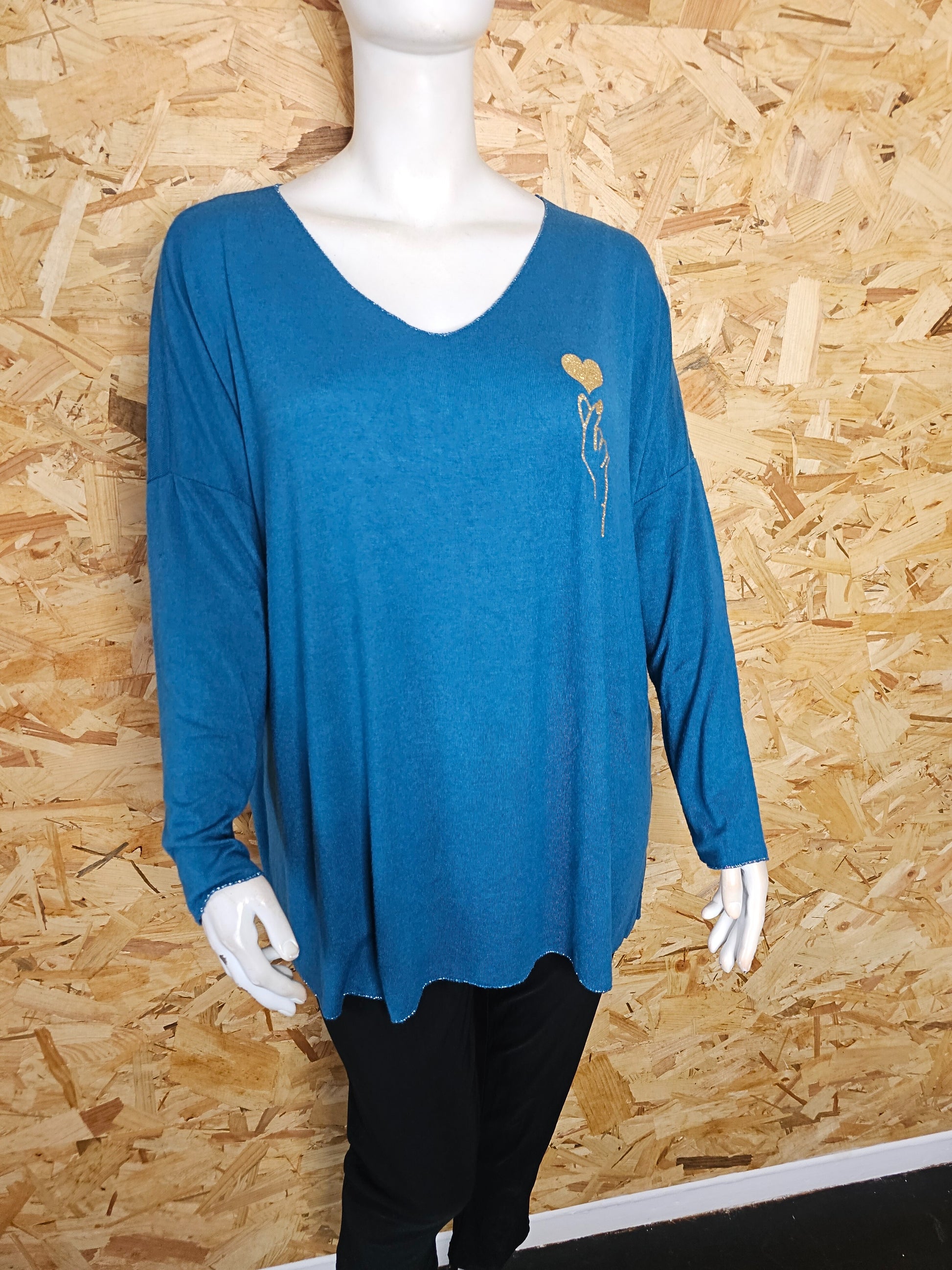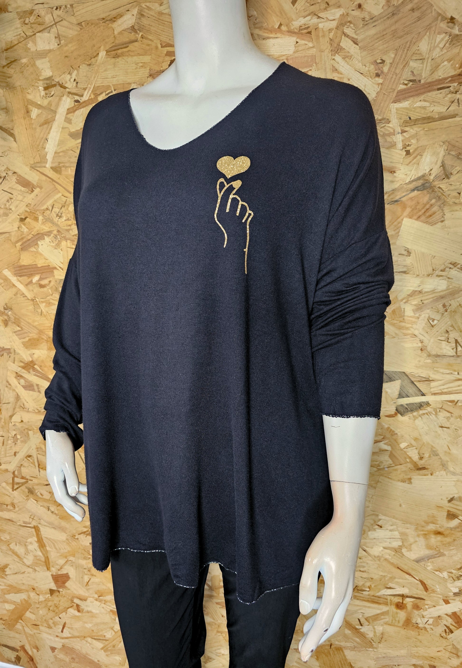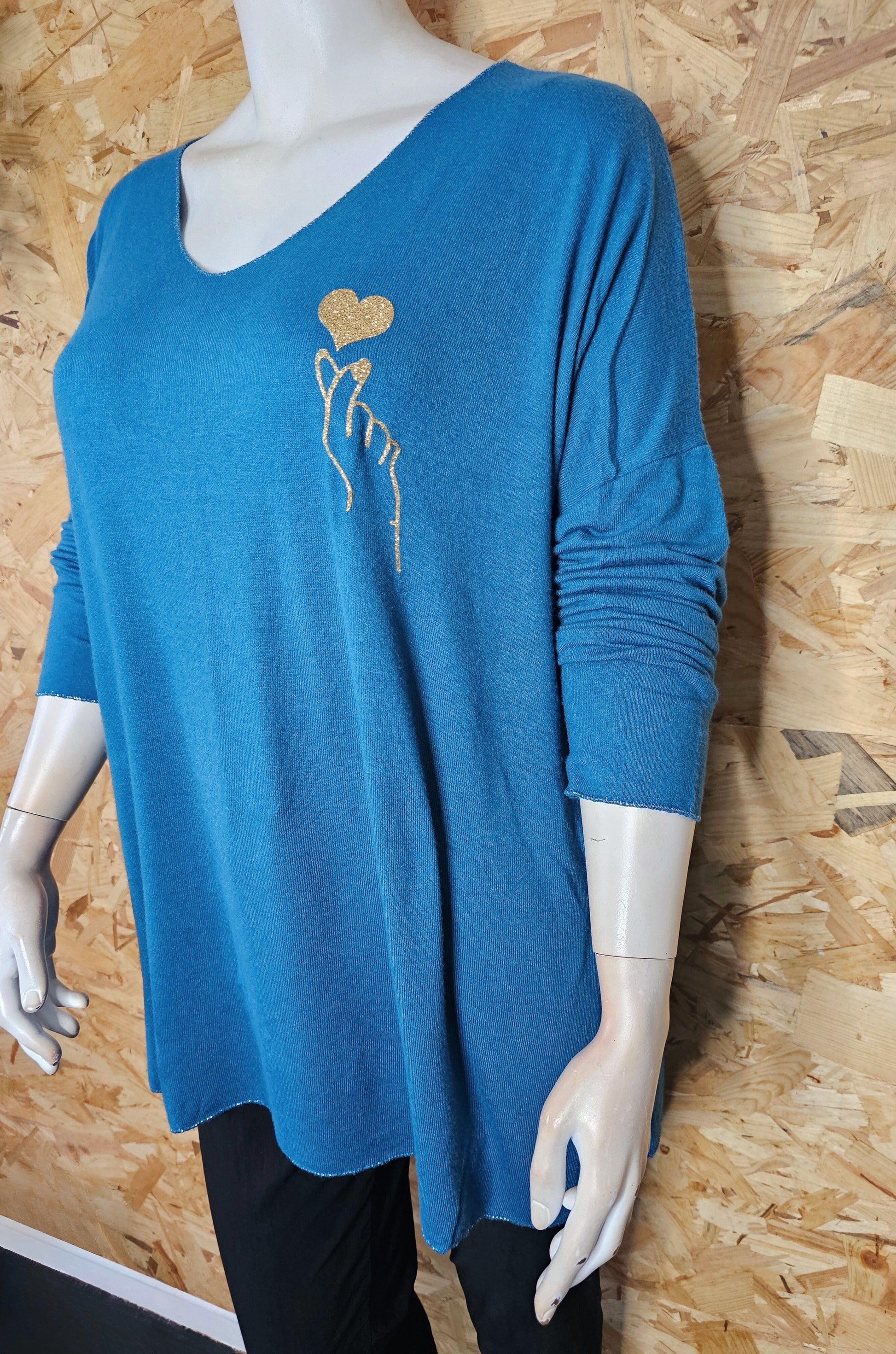 Ce pull en maille douce et souple possède un col V très féminin et une jolie touche de motif or brodé sur la poitrine avec 1 belle symbolique de "coeur sur la main" . Avec une longueur de 82 cm et un tour de hanches de 160 cm, il est parfait pour apporter une touche élégante à vos tenues quotidiennes. Le mélange de laine et d'élasthanne assure un confort optimal.