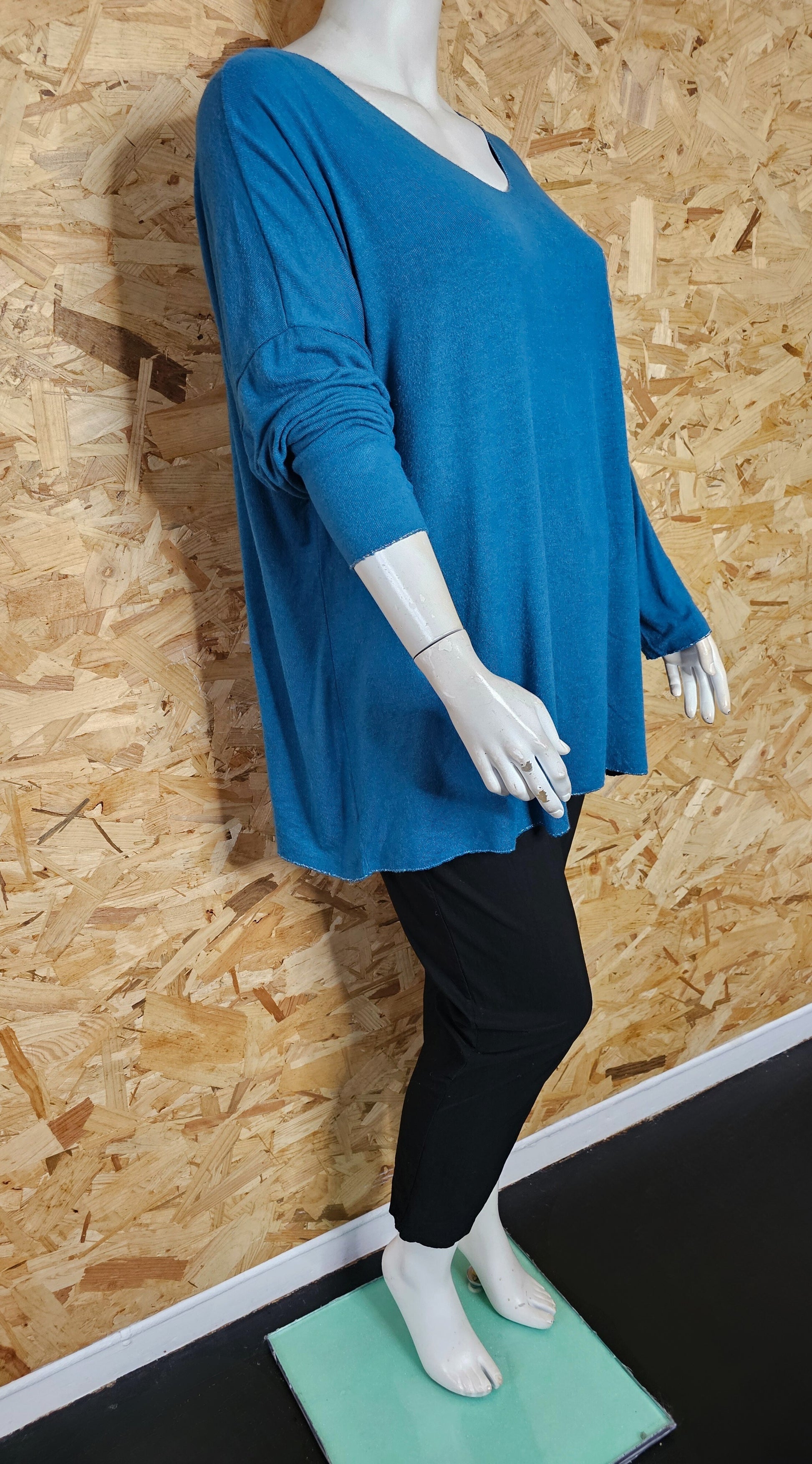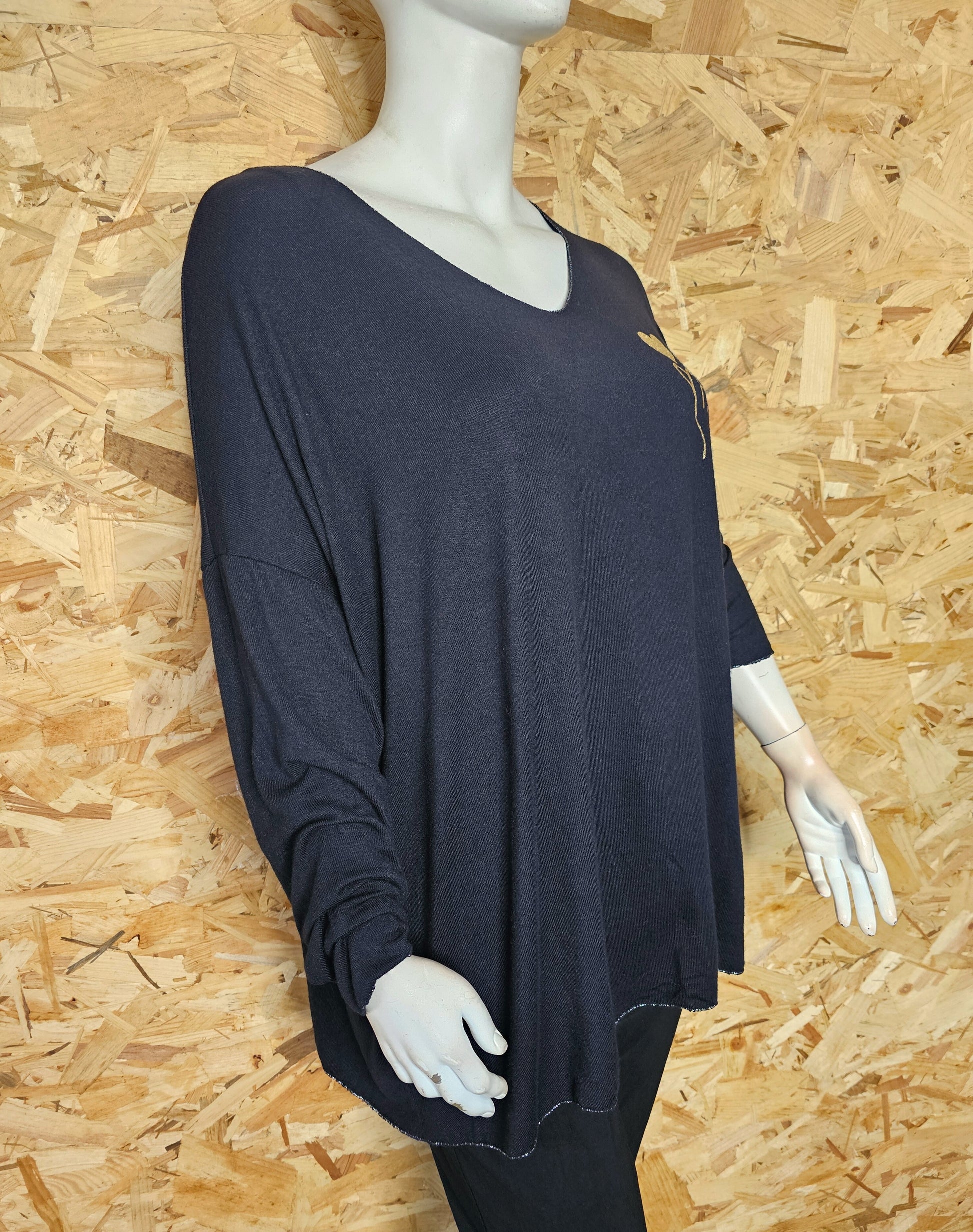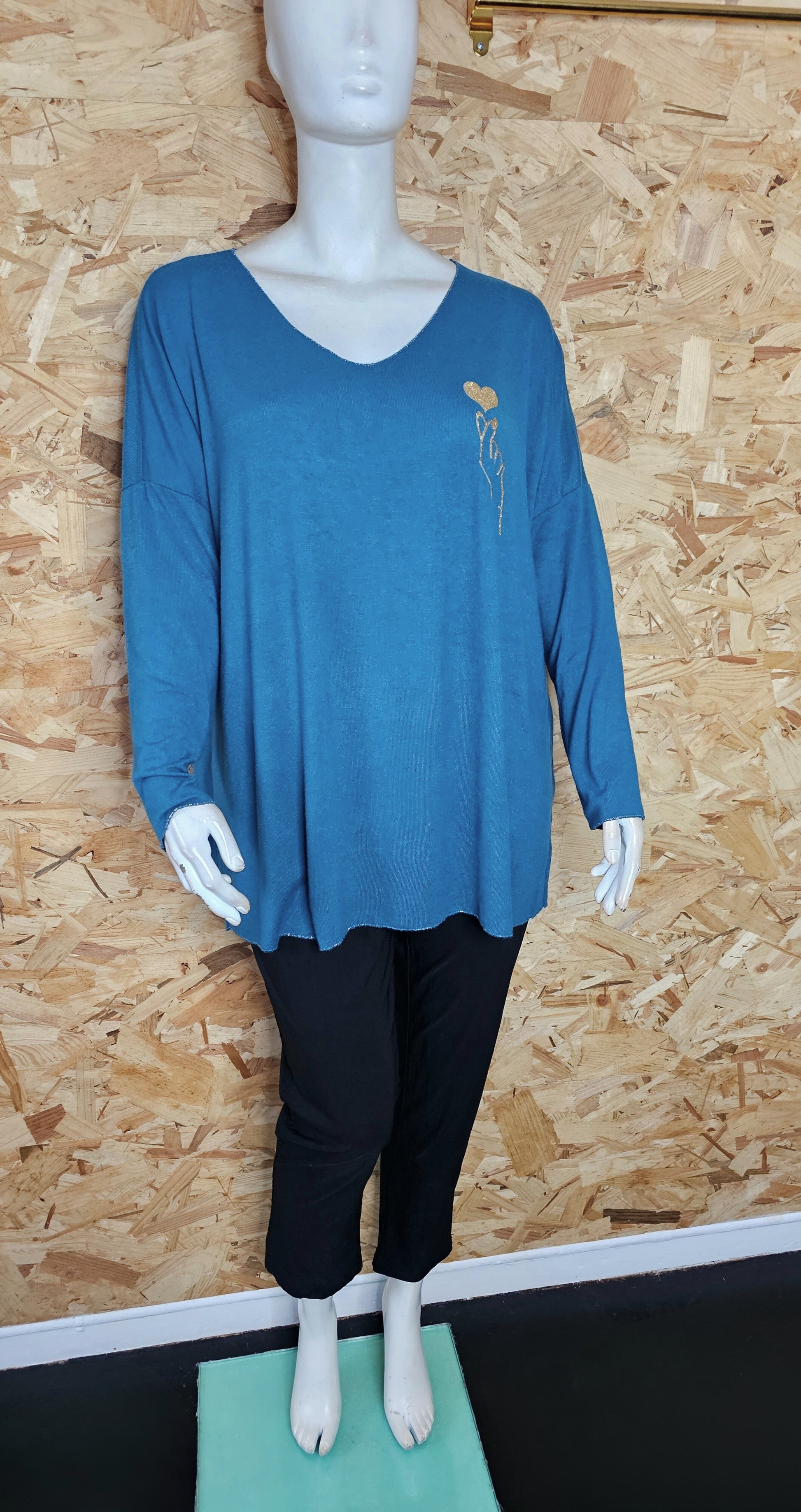 Ce pull en maille douce et souple possède un col V très féminin et une jolie touche de motif or brodé sur la poitrine avec 1 belle symbolique de "coeur sur la main" . Avec une longueur de 82 cm et un tour de hanches de 160 cm, il est parfait pour apporter une touche élégante à vos tenues quotidiennes. Le mélange de laine et d'élasthanne assure un confort optimal.