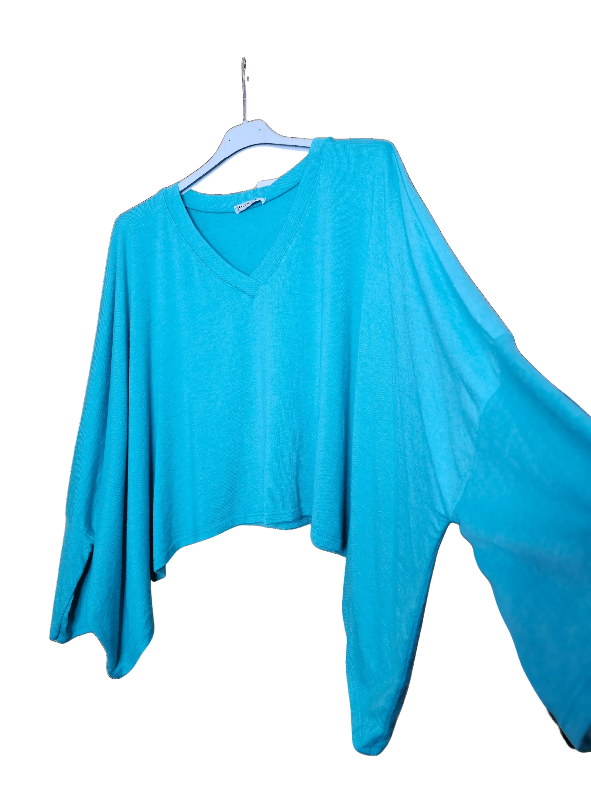 Pull oversize volontairement court pour exprimer tout son style en superposition. Col V en maille douce. Manches 3/4. Coupe rectangulaire avec épaules tombantes. Matière douce et extensible. TU pouvant convenir jusqu’au 60.