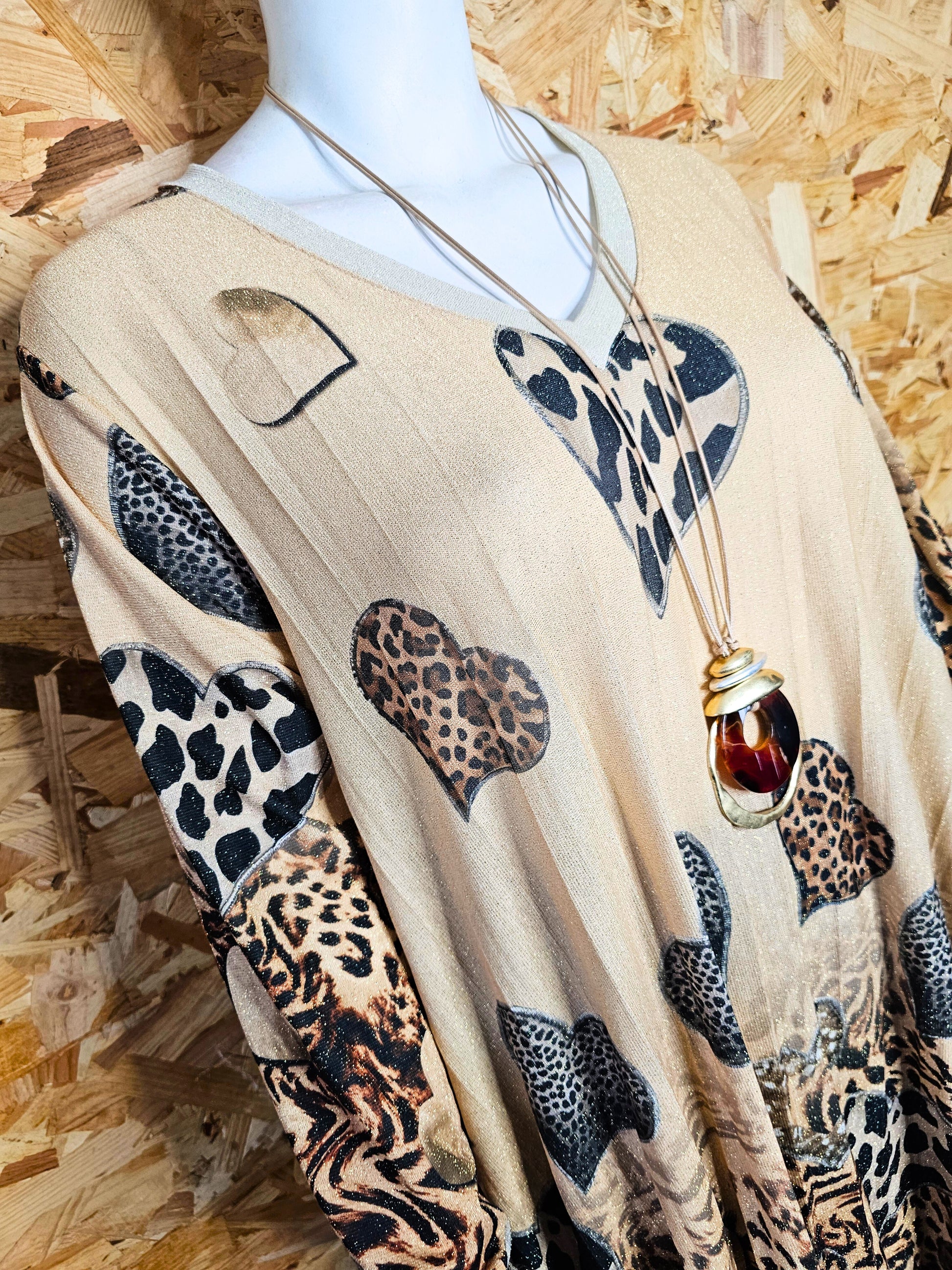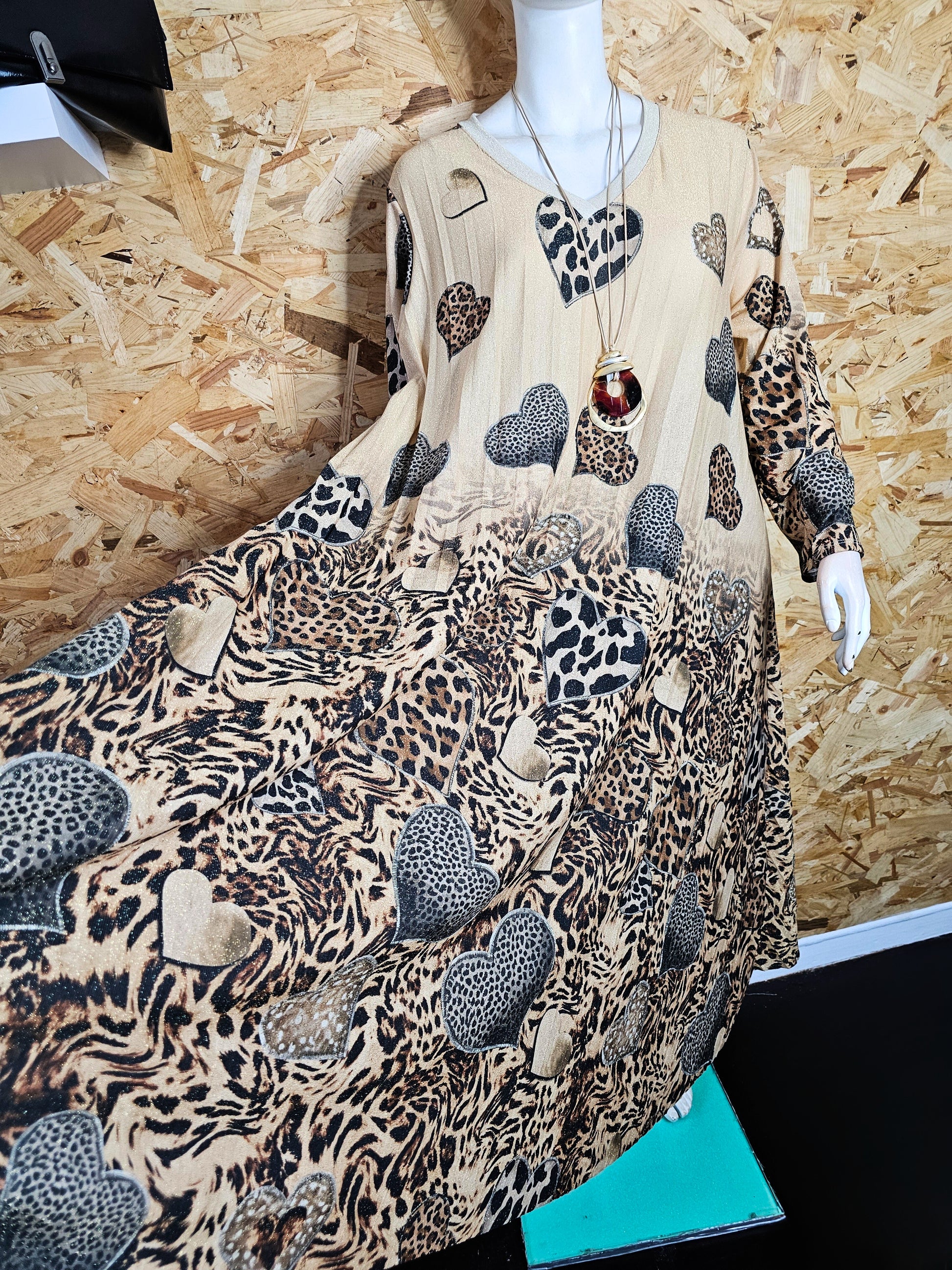 Cette robe longue aux motifs "animal print" et jolis cœurs allie élégance et confort grâce à sa matière lurex imprimée super stretch. Son plissé soleil apporte une magnifique amplitude, toute en fluidité, tandis que le col V souligne la féminité avec raffinement. Avec ses motifs artistiques stylés, elle se distingue par son originalité. Sa longueur de 135 cm et sa coupe évasée conviennent parfaitement aux tailles du 48/50 au 60, offrant ainsi une silhouette sublimée et confortable.
