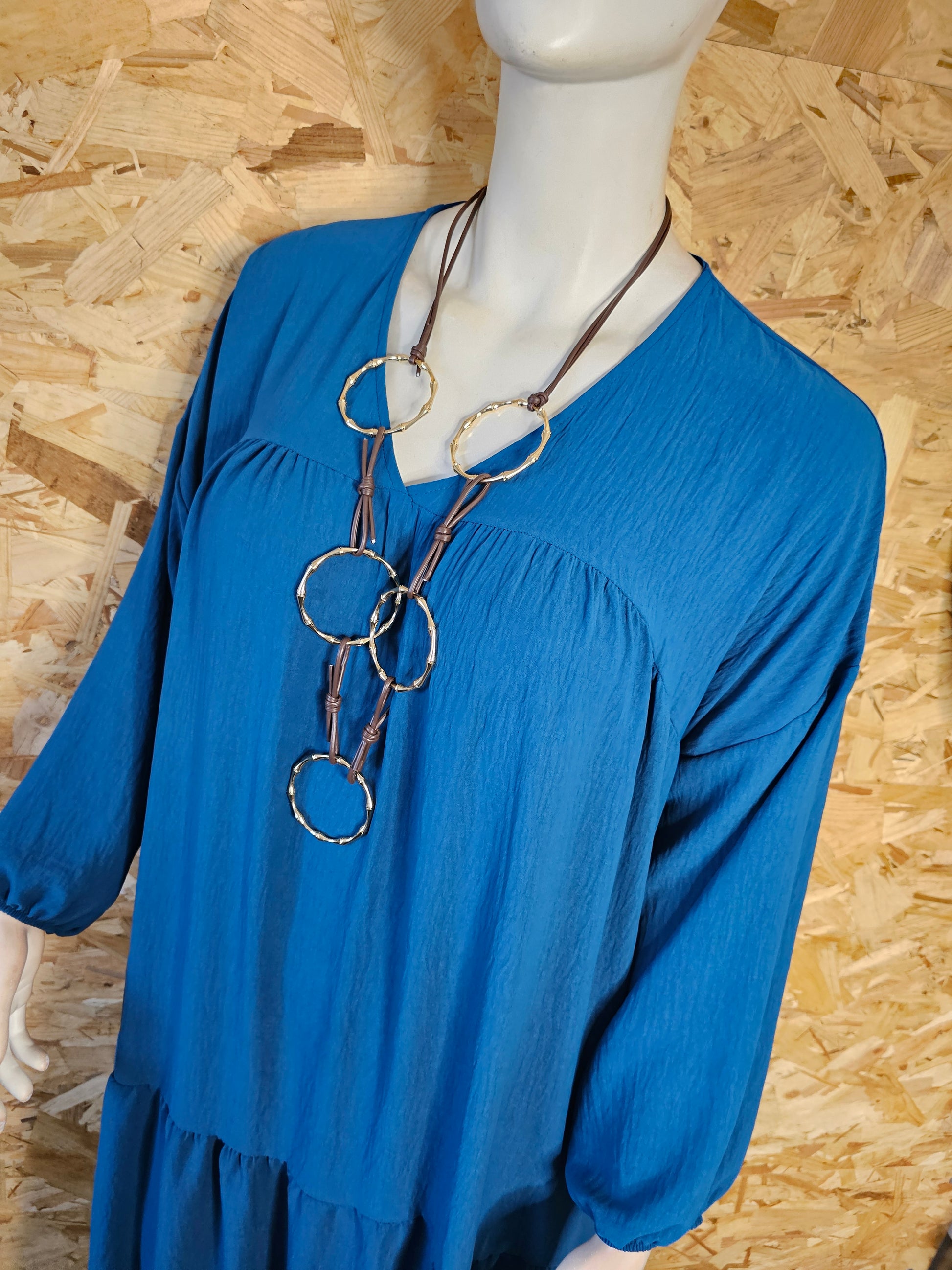 Ce sautoir allie élégance et originalité avec ses gros anneaux dorés reliés par des cordons en simili cuir chocolat. Idéal pour sublimer un look décontracté ou apporter une touche distinguée à votre style.