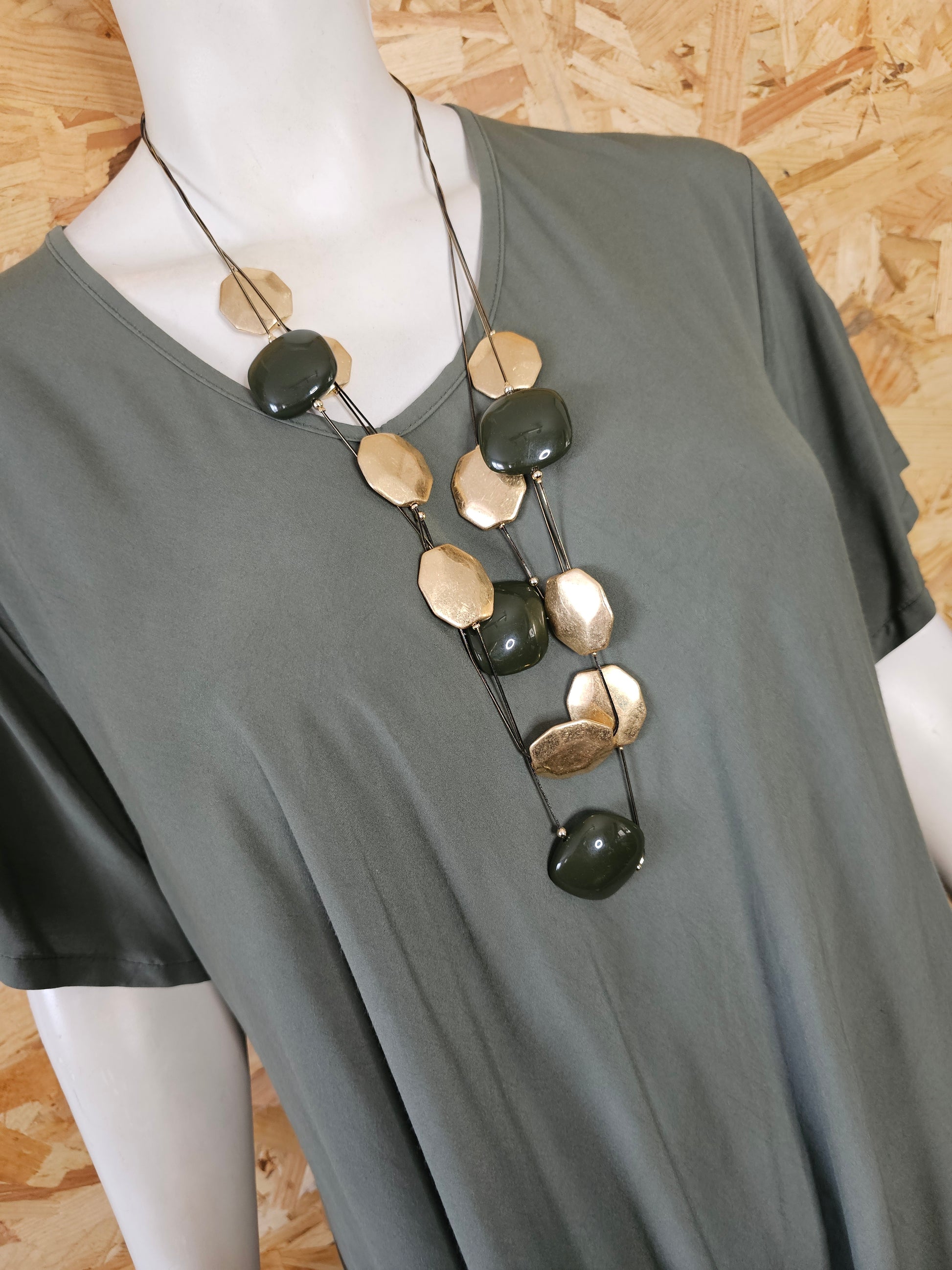 Sautoir multi rangs super raffiné avec son alternance de perles en résine kaki et ses perles or le tout monté sur des fils de métal.