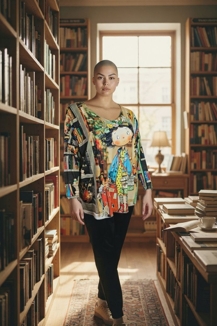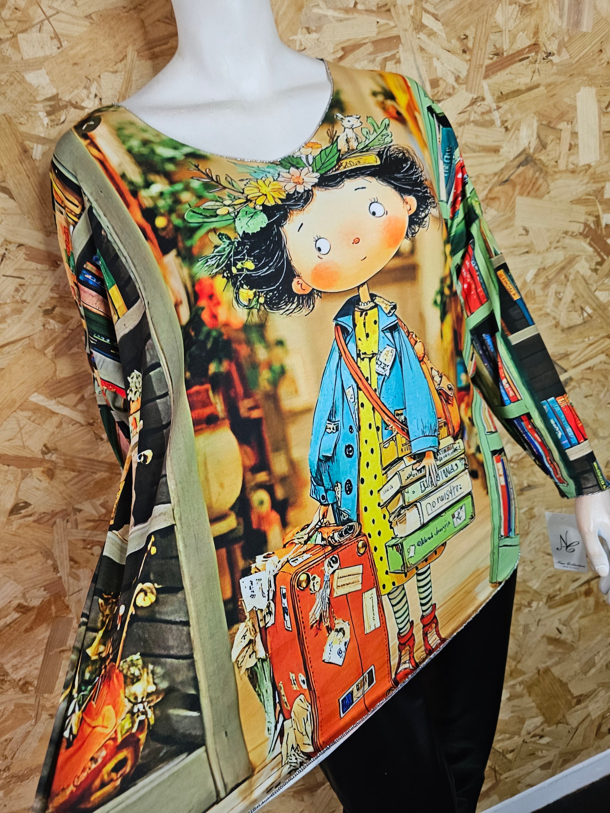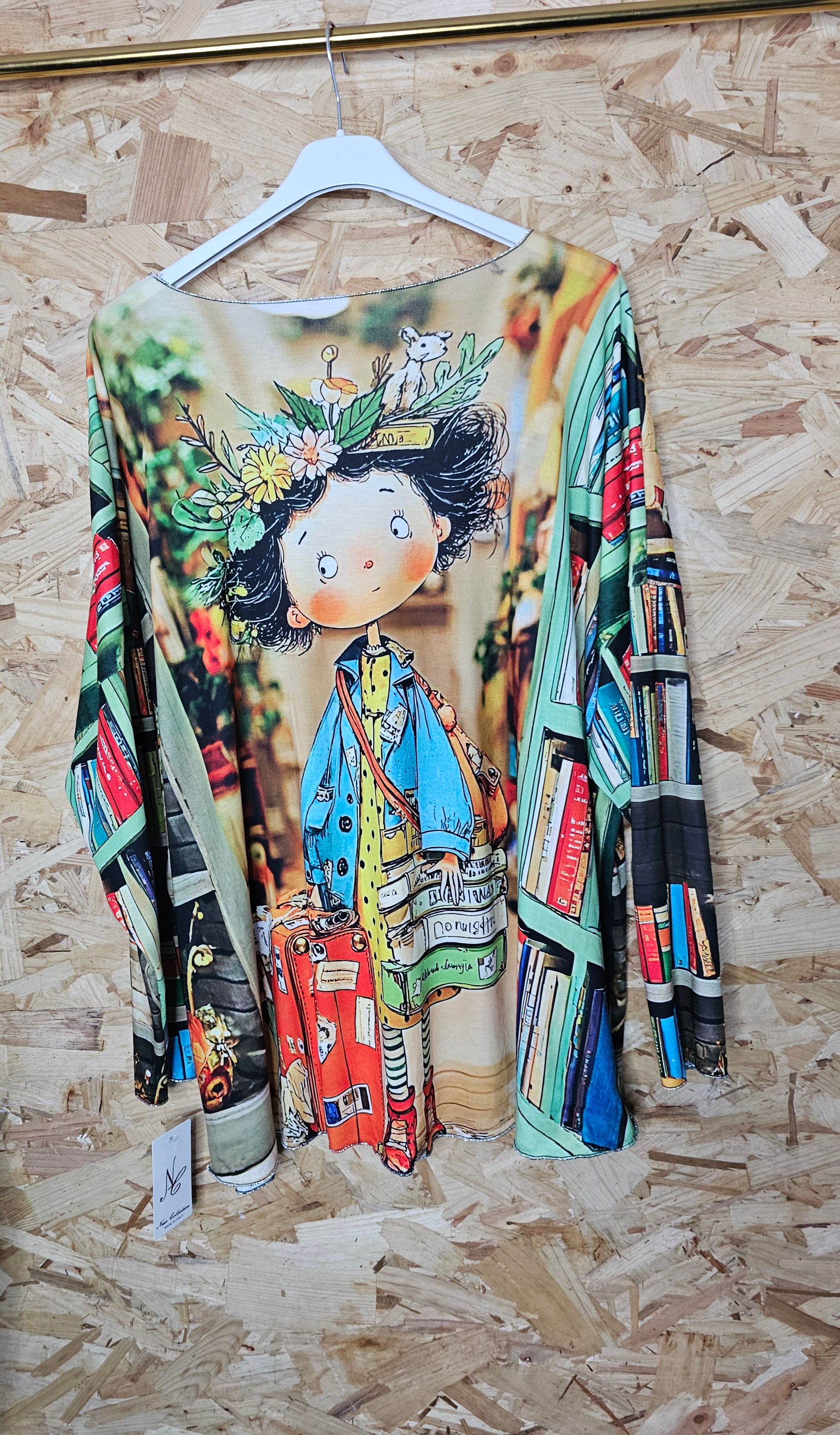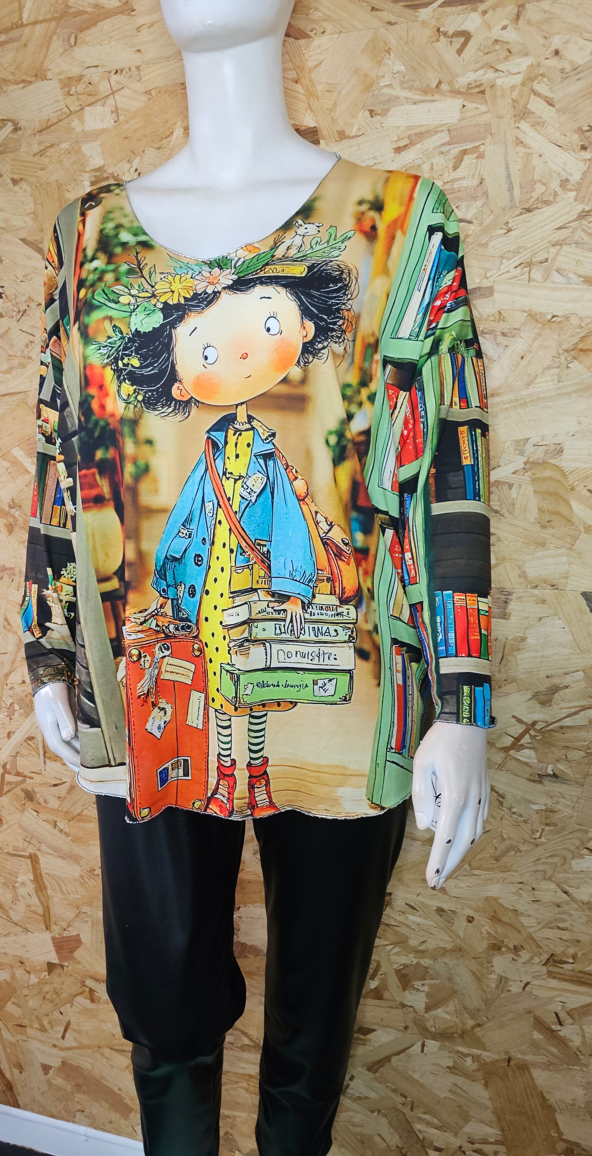 Ce tee-shirt à manches longues est non seulement très confortable grâce à son tissu élastique, mais également très original avec son motif représentant une fillette à la bibliothèque. Le col en V apporte une touche de modernité à ce vêtement. Parfait pour un look tendance et décontracté tout en exprimant votre passion pour la culture 😉