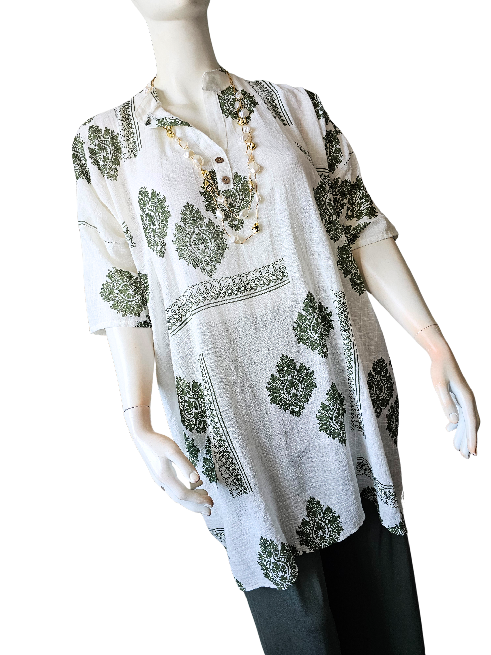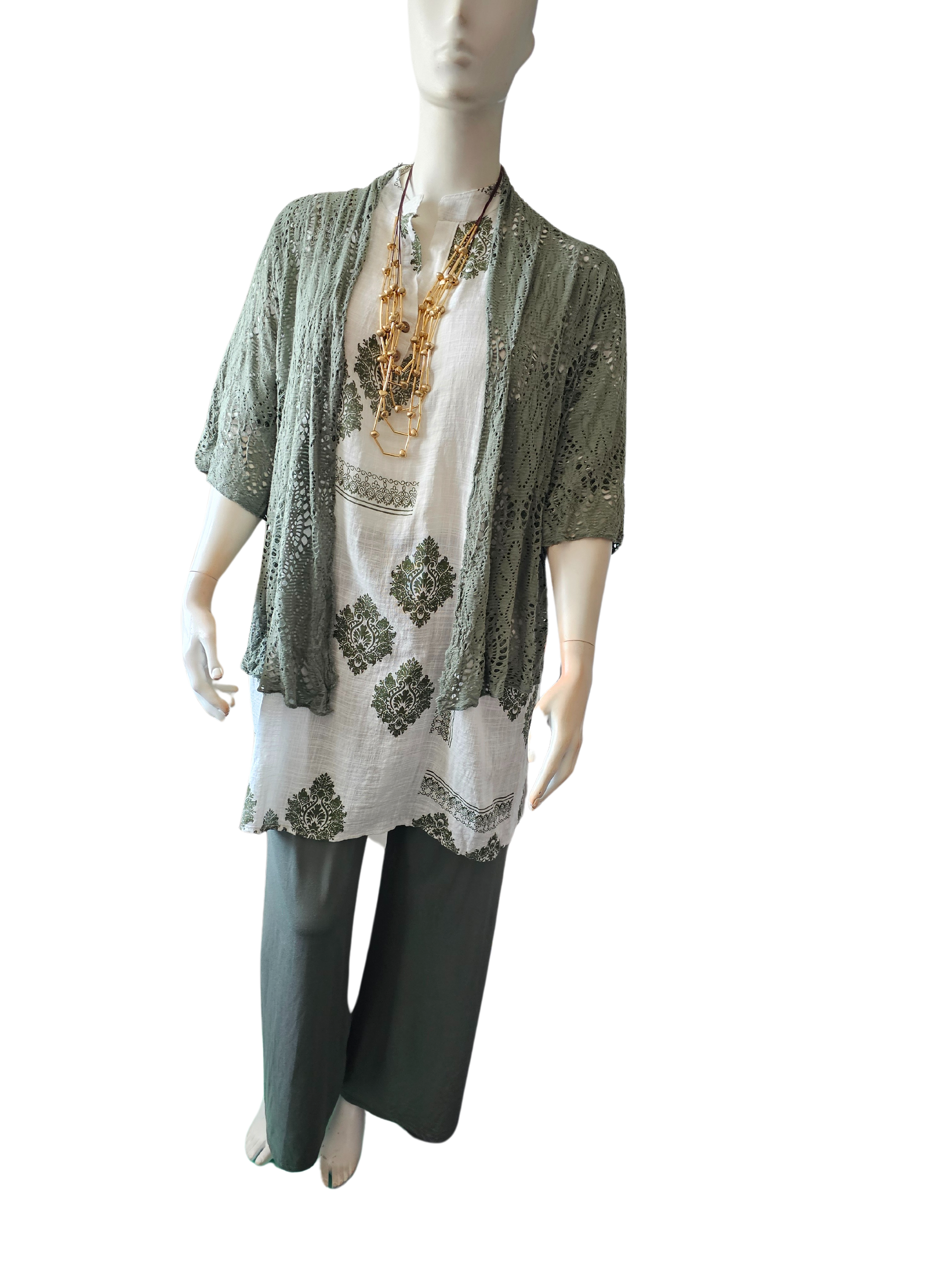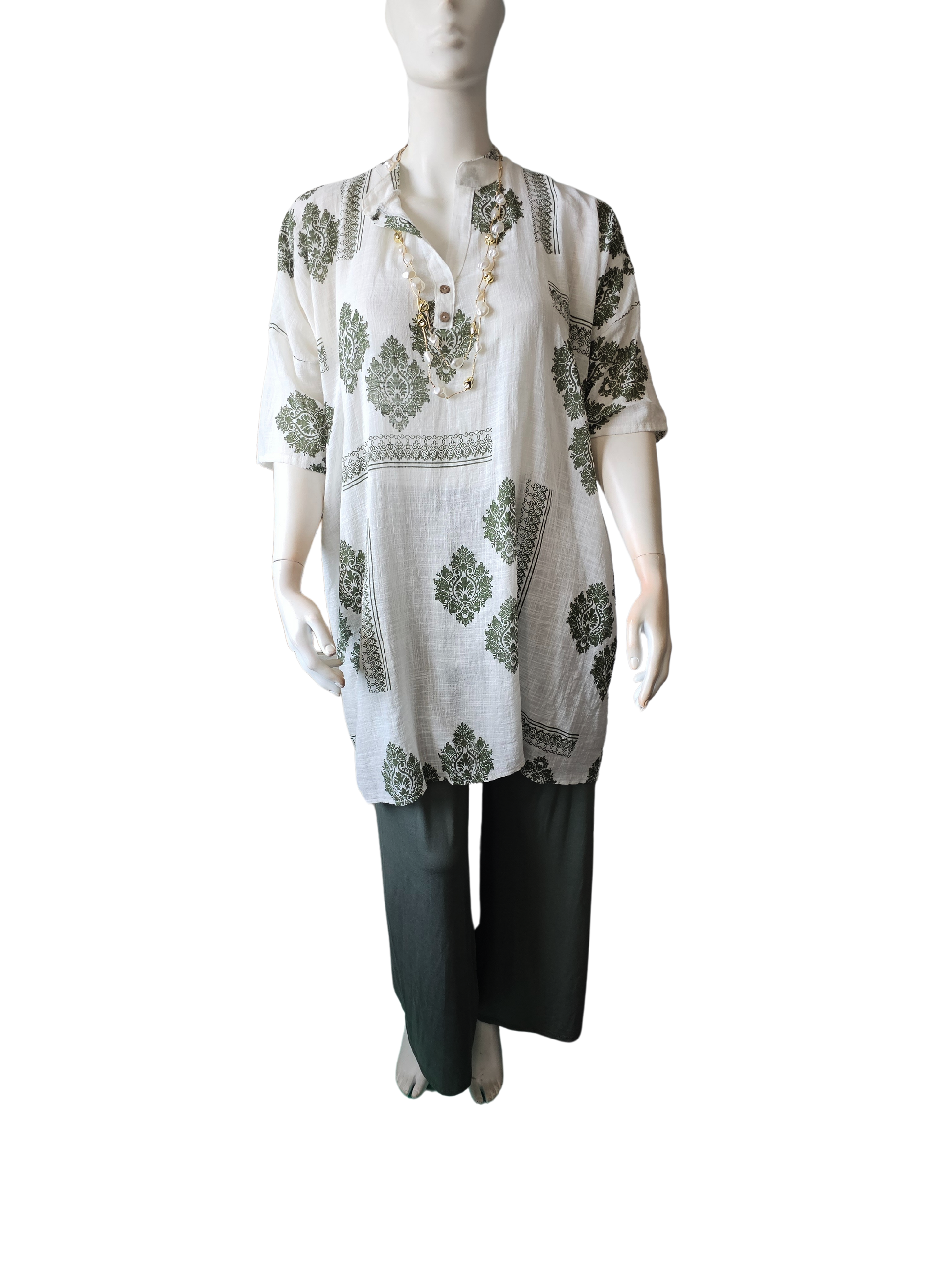 Sa matière ( façon toile de coton tissée ), lui donne un style très raffiné et cette coupe longue, sur un legging, un jean droit ou un palazzo fluide, rend super bien !