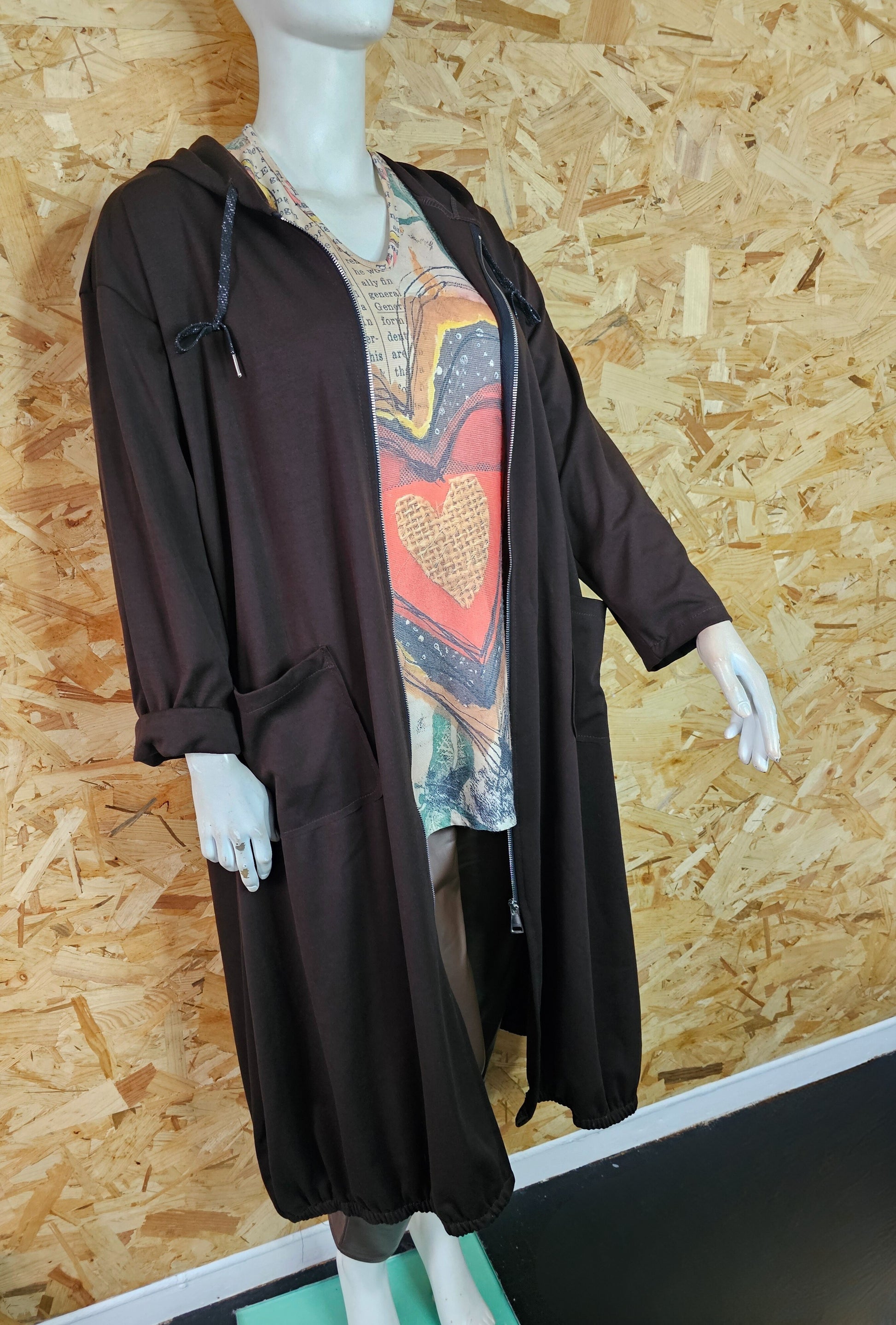 Cette veste longue entre sport et chic, inspirée des vestes sweat mais en version plus longue jusqu'à mi mollet ou cheville selon votre hauteur , est idéale pour celles qui veulent être au chaud mais pas en manteau. Avec sa capuche, ses poches et son zip de fermeture, elle offre à la fois un style tendance et original. Avec sa belle teinte chocolat, elle est super tendance ! Un confort optimal grâce à sa matière souple et sa coupe boule froncée par un élastique en bas. Parfaite pour toutes les occasions, elle convient du 48/50 au 58/60