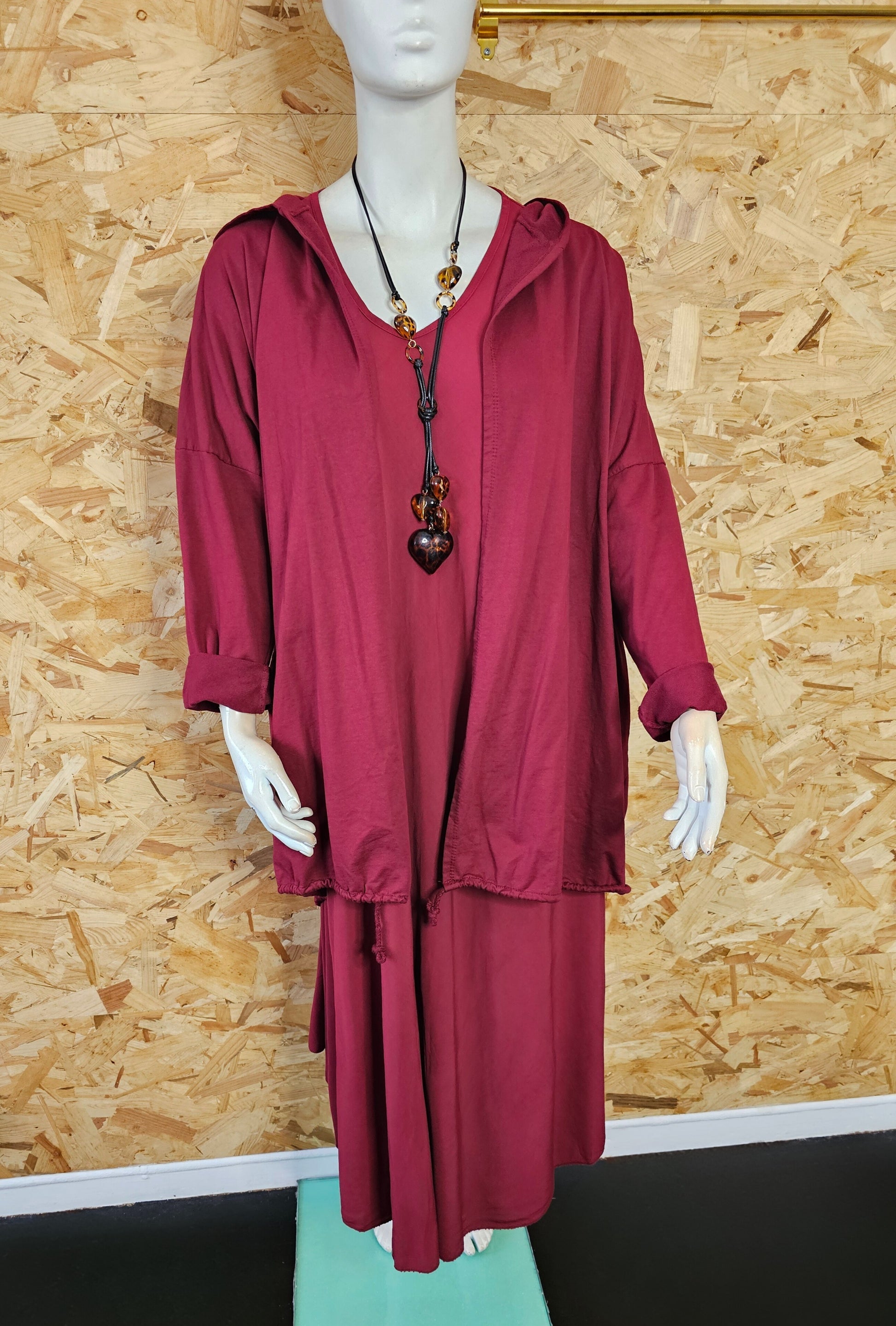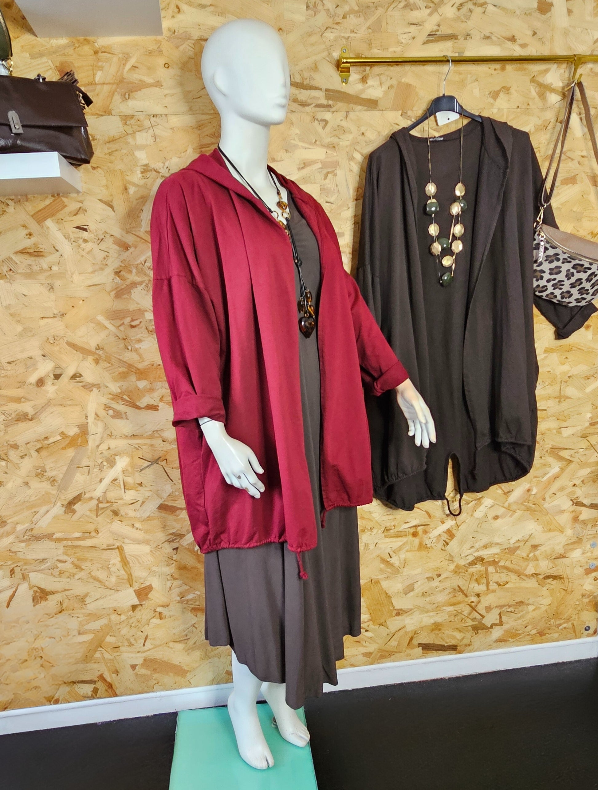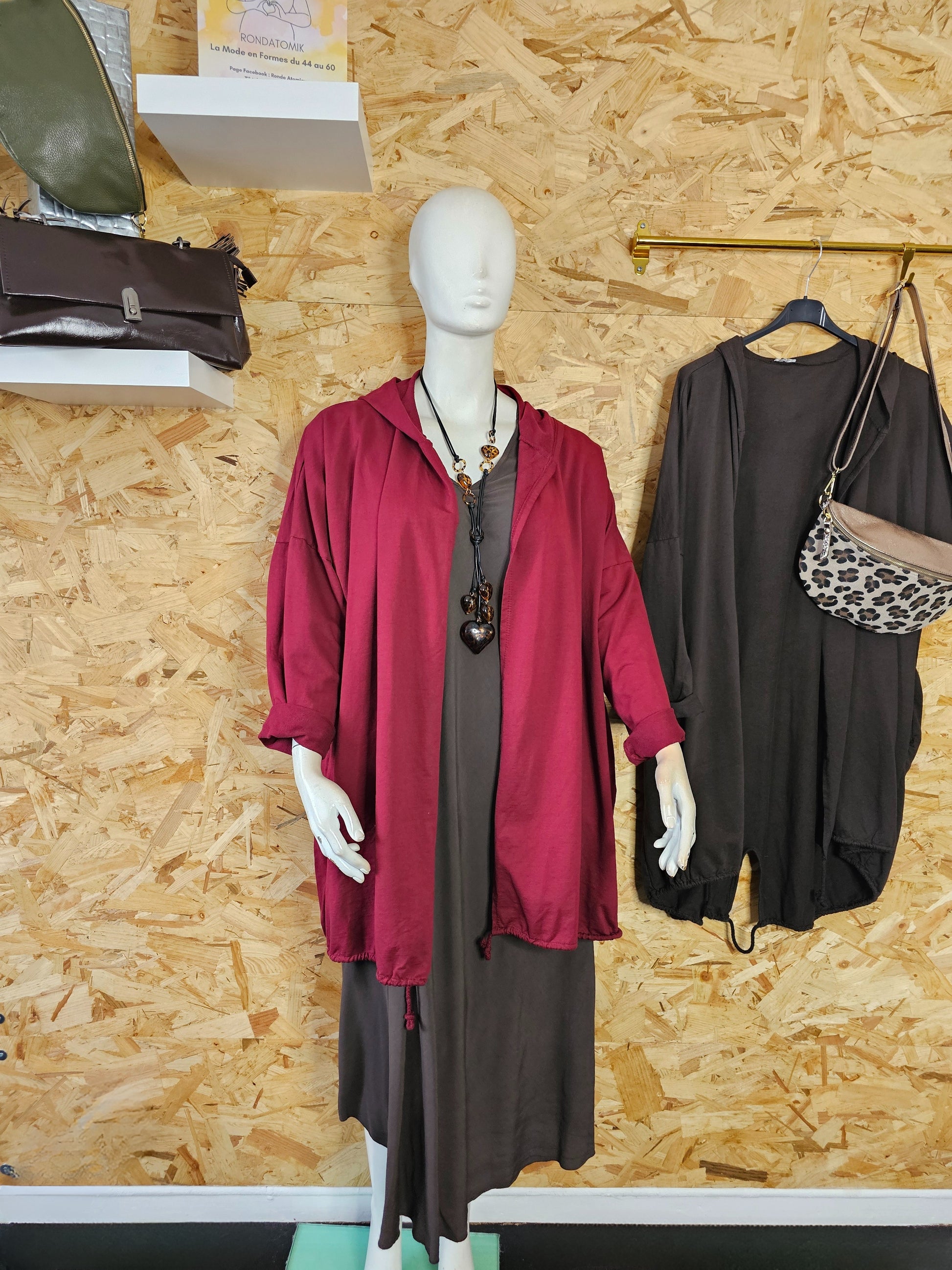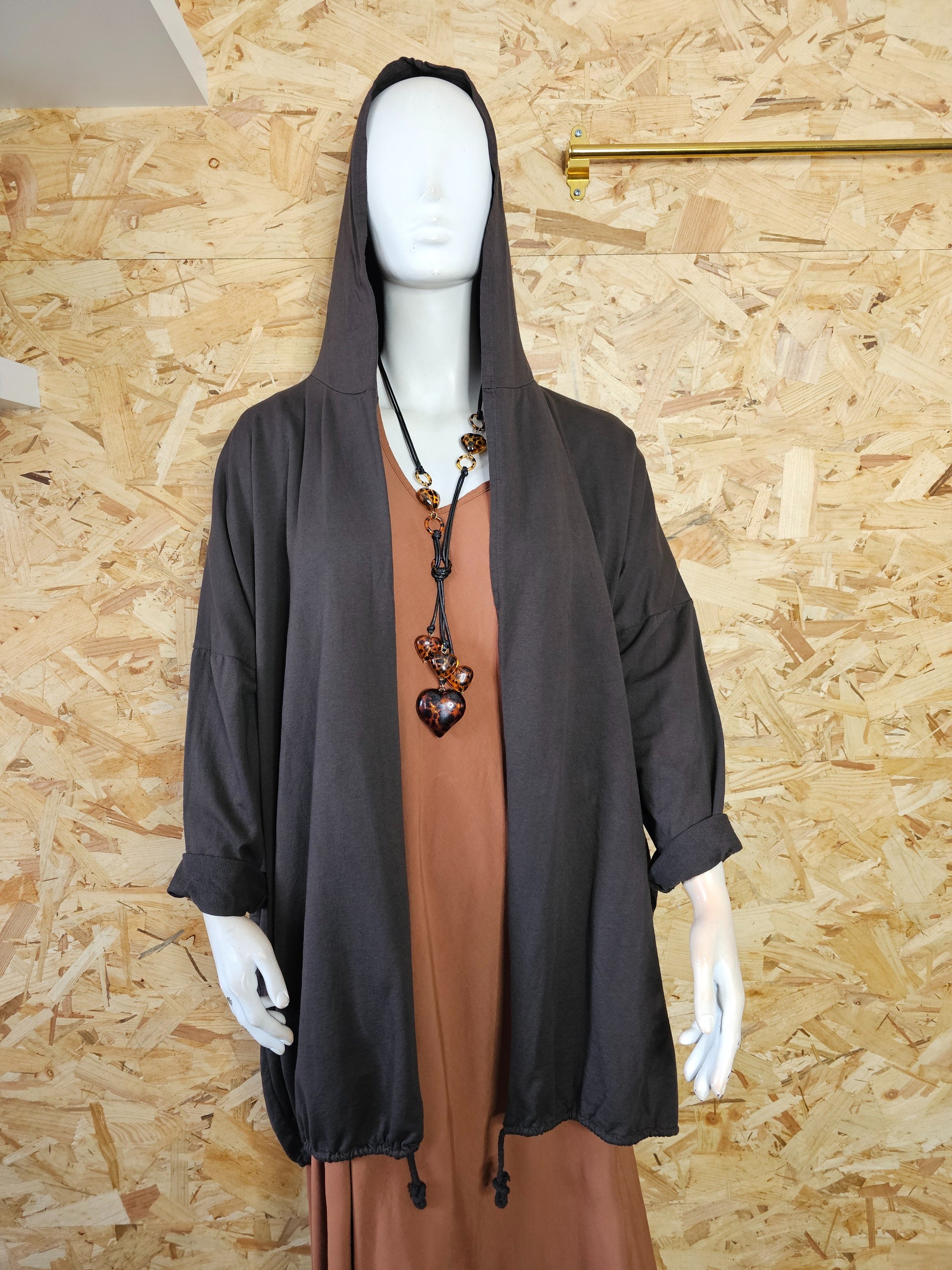 Modèle long, coupe droite, capuche, cordon de resserrage en bas pour ajuster et faire blouser selon votre gout.